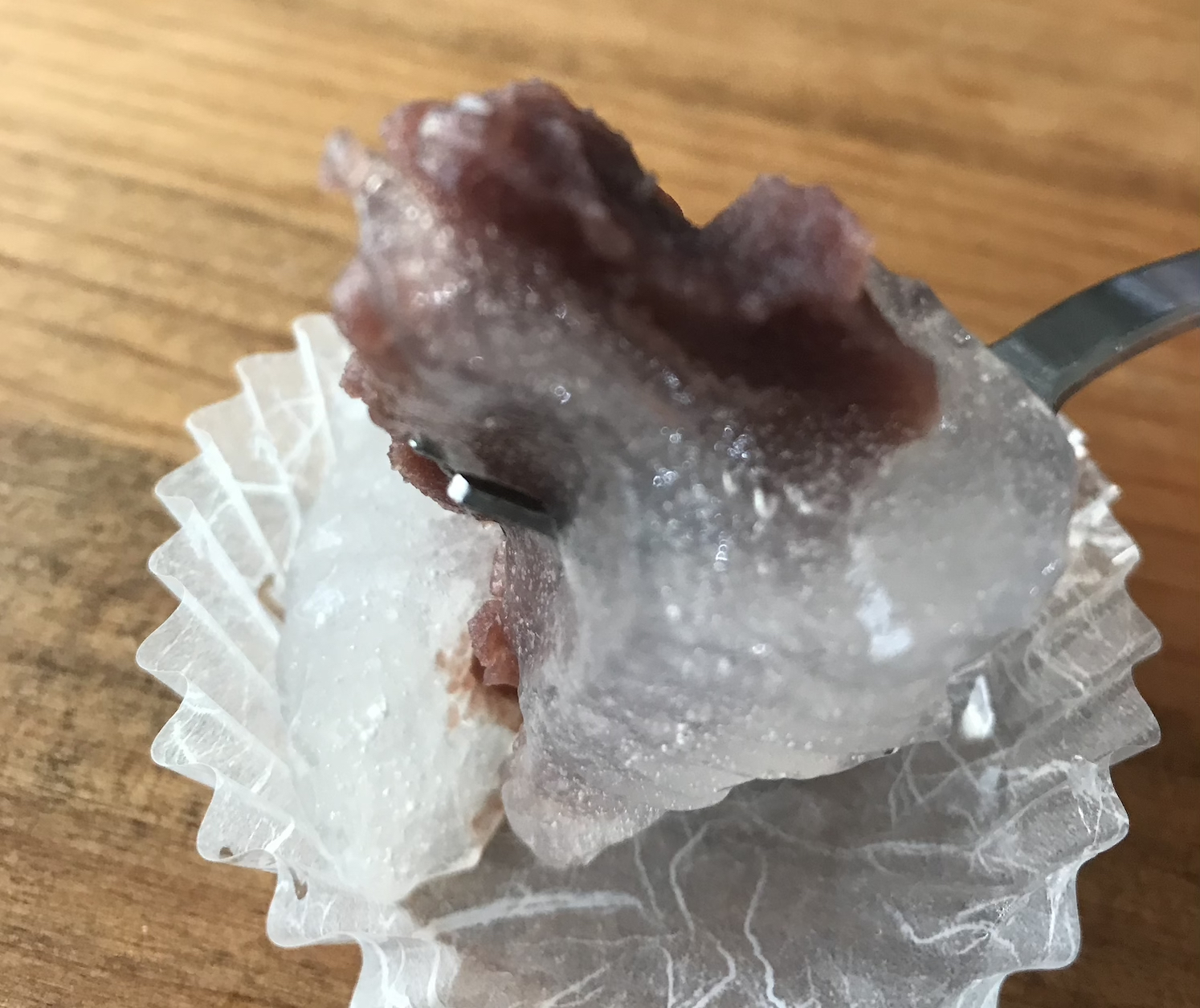 透明感のある、とろっとろ、つるっつるの葛に包まれた、甘さ控えめのこしあんが入っている。